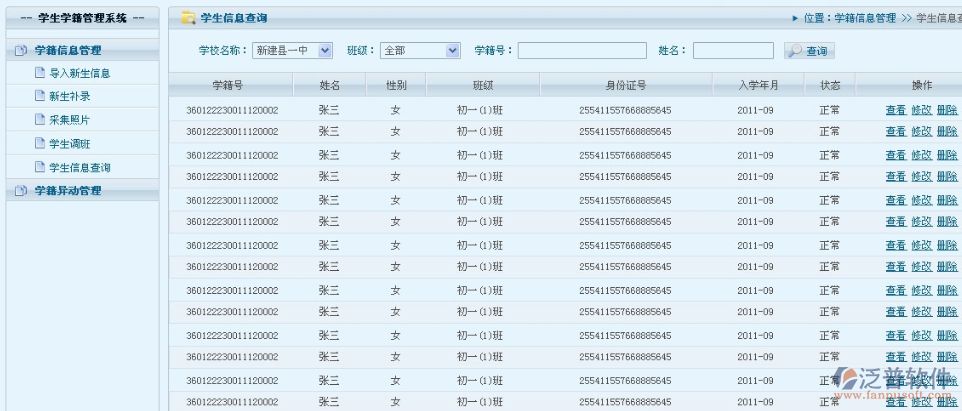1、學(xué)籍管理系統(tǒng)功能全面 系統(tǒng)涵蓋了小學(xué)、初中、高中學(xué)籍管理工作中的學(xué)生基礎(chǔ)信息管理、學(xué)生異動(dòng)管理(轉(zhuǎn)班、轉(zhuǎn)校、休學(xué)、復(fù)學(xué)、留級(jí)、退學(xué))、畢業(yè)生信息管理(小學(xué)畢業(yè)、初中畢業(yè)、高中畢業(yè))、獎(jiǎng)懲管理等多項(xiàng)管理功能。