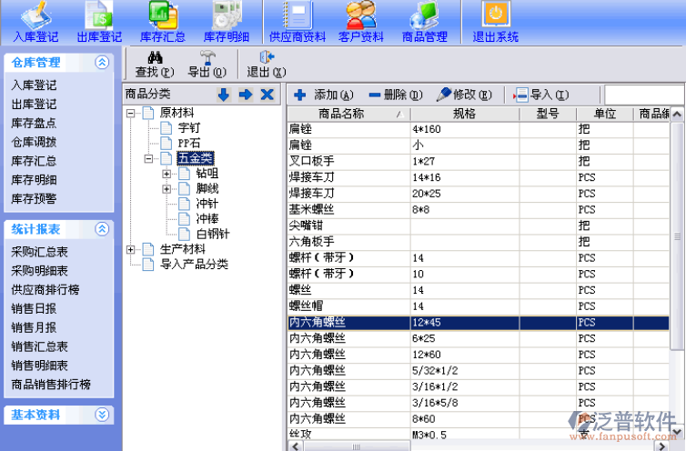 泛普軟件倉儲管理系統(tǒng)是一款專為中小企業(yè)或個體工商戶而設(shè)計開發(fā)的倉庫管理軟件,軟件功能實用,界面大方,操作方便。 倉儲管理軟件可快速進行出庫、入庫,庫存查詢等操作,并有十余種統(tǒng)計報表讓您快速進行數(shù)據(jù)分析,助您把握商機,決勝商場。